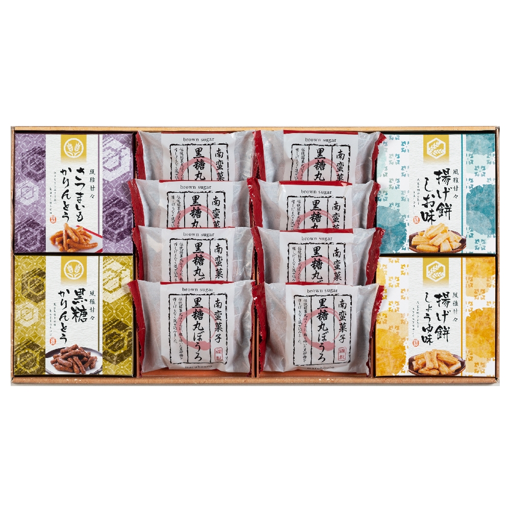 内容:黒糖丸ぼうろ×8個、揚げ餅(しお味)20g×1個、揚げ餅(しょうゆ味)20g×1個、さつまいもかりんとう30g×1個、黒糖 かりんとう30g×1個