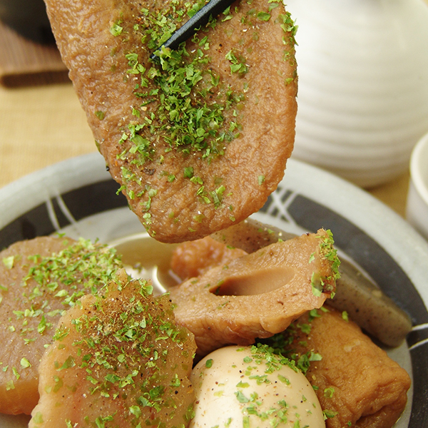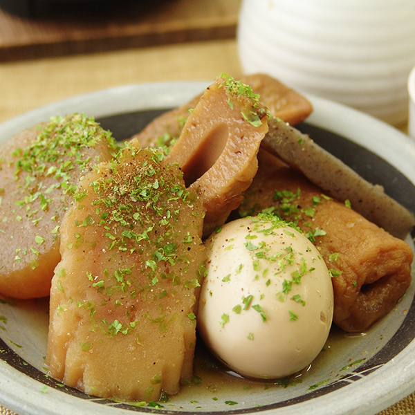 焼津ならではのかつおだしベースに、焼津おでんの代表格である黒はんぺん、なると等の練り物を加え、じっくり煮込みました。仕上げにだし粉をかけていただくのが、焼津流です。湯煎するだけでご当地のおいしさを簡単にお召しあがりいただけます。