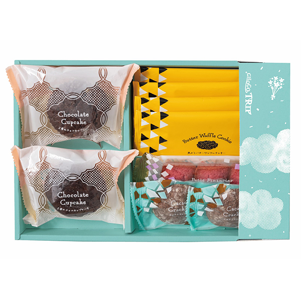 内容:2層のチョコカップケーキ・カカオクラックル×各2個、焦がしバターワッフルクッキー×4枚、プチフィナンシェ(フランボワーズ)×1袋(3個入) 合計9個