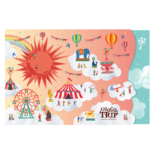 ふんわり2層のチョコカップケーキ、ホロっしっとり新食感なブラウニー、焦がしバター香るキャラメリゼされたワッフルクッキー、いろどりプチサイズのフィナンシェ。楽しさ詰まった、魅惑のお菓子たちで、食べあう人に笑顔の時間をプレゼントします。チョコをきっかけに魅惑の遊園地へトリップさせてくれる『CHOCOTRIP』からの贈り物。今回は「太陽のサーカス」。あたたかな太陽と七色の虹に見守られながら、明るくにぎやかなサーカスを楽しんでいただく世界になっています。