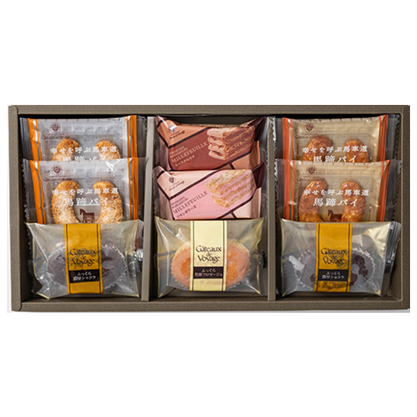 内容:馬蹄パイ(キャラメル・シュガーバター)・スフレ濃厚ショコラ×各2個、ミルフイユ(キャラメルラテ・フランボワーズ)・スフレ芳醇フロマージュ×各1個