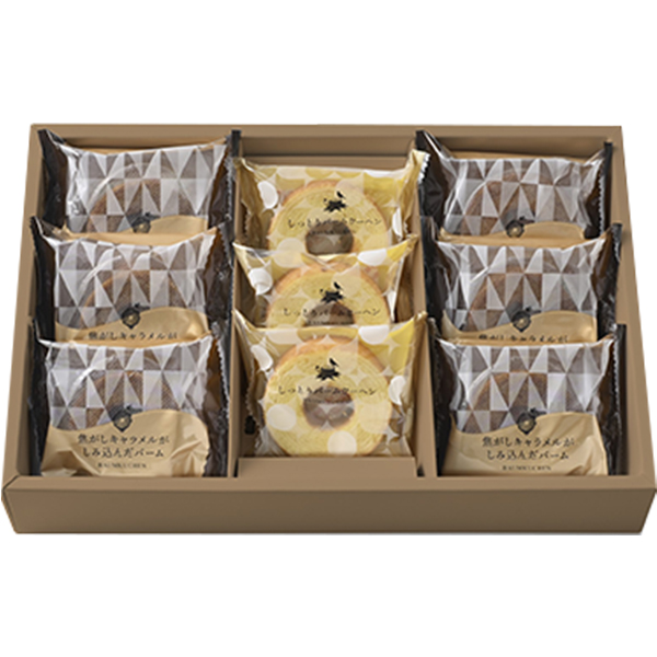 内容:焦がしキャラメルがしみ込んだバーム×6、しっとりバームクーヘン×3