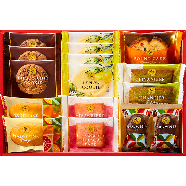 内容:オレンジマドレーヌ×2個、ストロベリーショコラケーキ×2個、ピスタチオフィナンシェ×2個、ブラウニー×2個、ブラウンシュガーパウンドケーキ×1個、チョコチップクッキー×3個、レモンクッキー×4個