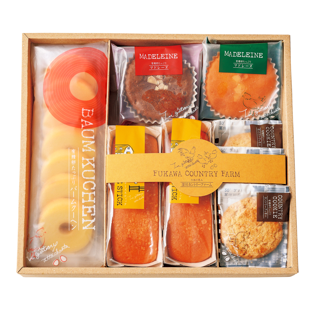 元気なたまごをたっぷりと。ちょっと贅沢なティータイム。有精卵をたっぷり使ったスイーツの詰合せ。ミニバームクーヘンや、二つの味のマドレーヌなどバラエティ豊富だから、みんなの集まりが華やぎます。