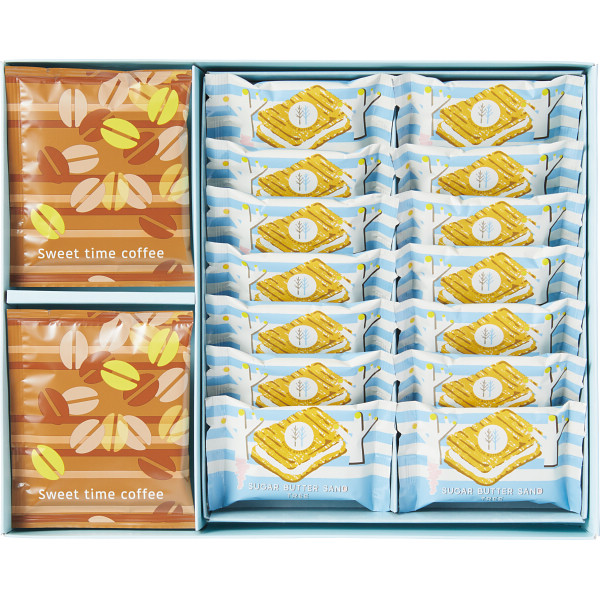 サクサク食感がたまらないシュガーバターサンドの木とコーヒーをひとつのセットに。贈りものとして人気のシュガーバターサンドの木。サンドの甘さを引き立てるようブレンドした深煎りのビターコーヒーと一緒にお楽しみください。