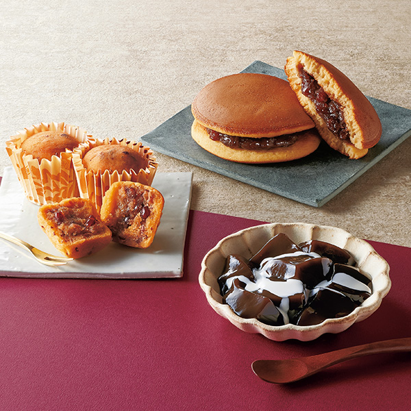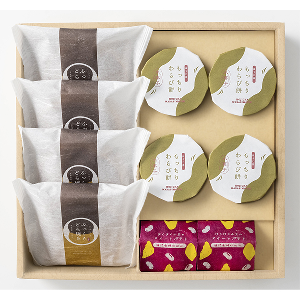 内容:ふっくらどら焼き×4個、もっちりわらび餅×4個、ほくほく小豆のスイートポテト×2個
