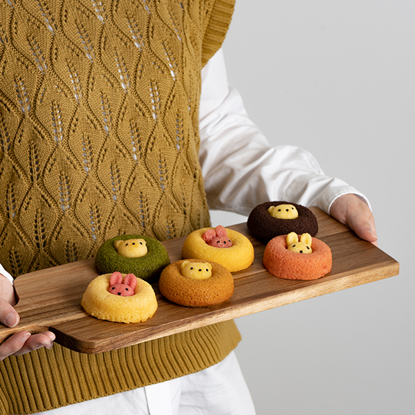 真ん中から動物たちがひょっこり顔を出した焼きドーナツ。その愛嬌のある見た目は、食べるのがもったいなくなるほど。かわいいボックスがギフトにもぴったりです。