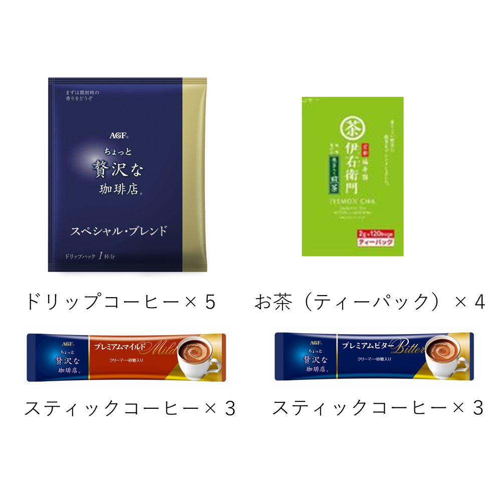内容:伊右衛門 抹茶入煎茶ティーパック×4、AGF「ちょっと贅沢な珈琲店」ドリップ スペシャルブレンド×5、スティック プレミアムビター・マイルド×各3