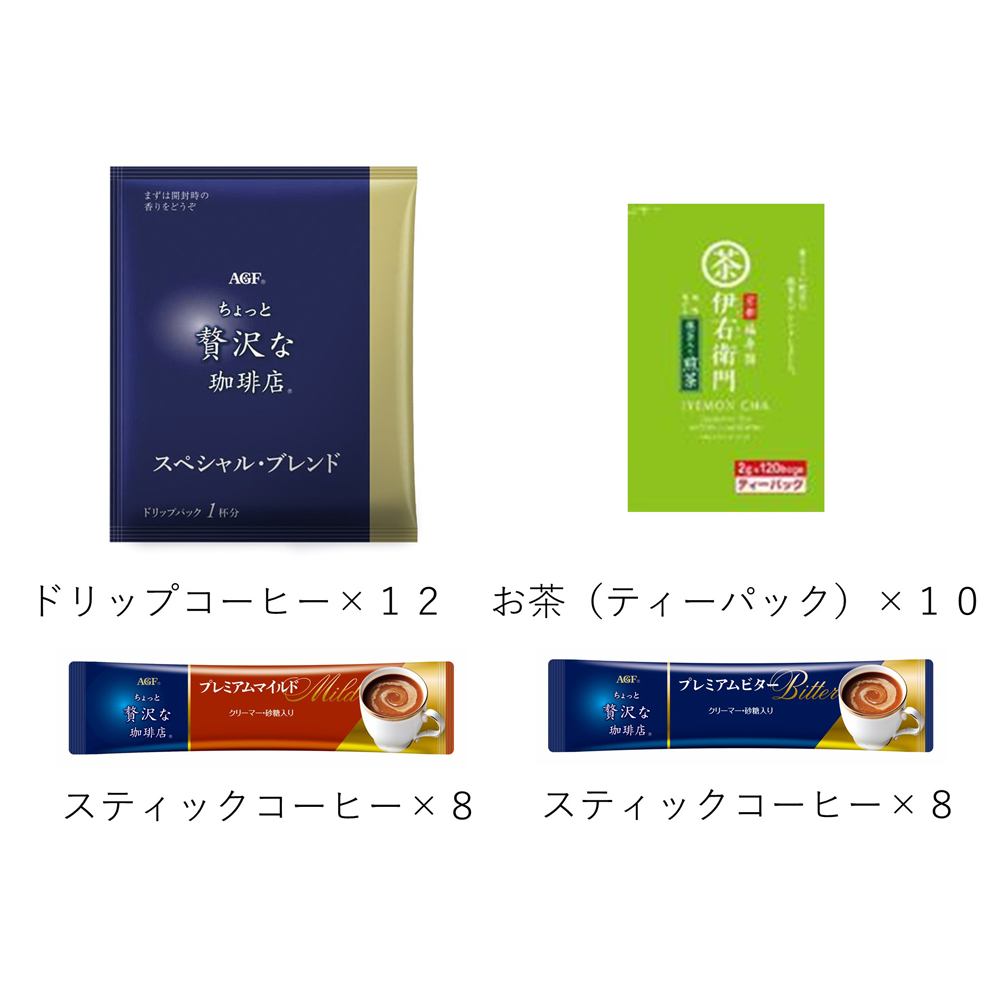 簡単手軽にお楽しみいただけるAGF「ちょっと贅沢な珈琲店」のコーヒーと、香り豊かでスッキリとした飲み口の緑茶のセットです。