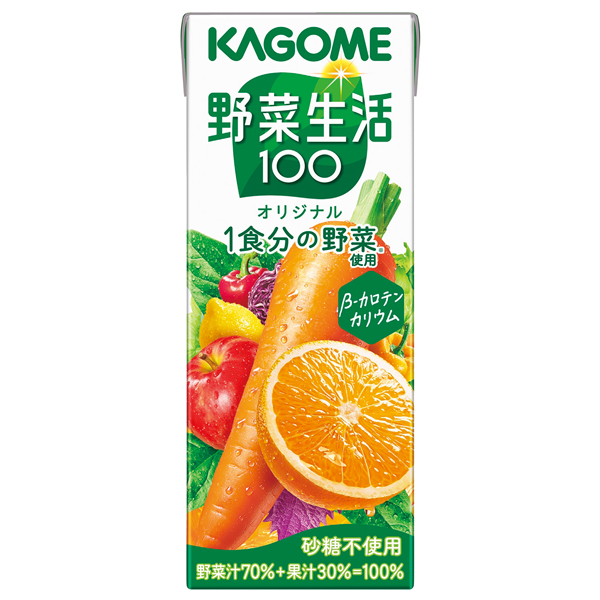 「野菜生活100」オリジナルは、20種類の野菜と3種類の果実を使用した野菜果実ミックスジュースです。1食分の野菜※を使用し、野菜汁70%+果汁30%=100%。野菜比率70%でありながらフルーティーなおいしさを実現。β‐カロテンの高いにんじん汁を厳選。にんじんの青臭い香りをカットし、にんじん汁のコクと甘みで家族みんながおいしく手軽に野菜を補えます。※厚労省推進・健康日本21の目標値(1日350g)の約1/3である野菜120g分。野菜の全成分を含むものではありません。