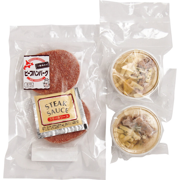 内容:十勝清水牛ハンバーグ(牛肉使用)100g×2、ソース30g×1、北海道ビーフグラタン110g×2