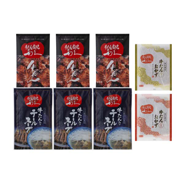 内容:牛たん真空パック(塩味)100g×3、冷凍牛たん入りテールスープ250g×3、牛たんおかず塩味120g、牛たんおかず味噌味120g