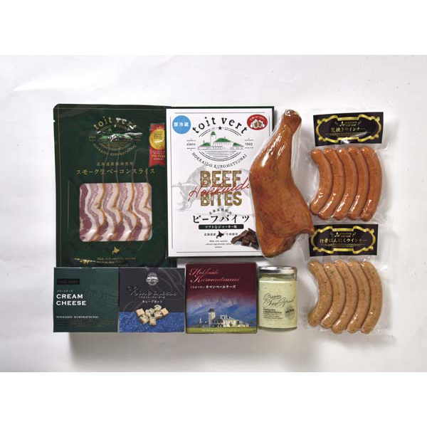 内容:スモークチキン250g、スモーク生ベーコンスライス90g、ビーフバイツ70g、くろまつないカマンベールチーズ120g、クリームチーズスプレッド(バジル)110g、くろまつないクリームチーズ100g、ブルーチーズキューブ50g、荒挽きウインナー、行者にんにくウインナー各125g