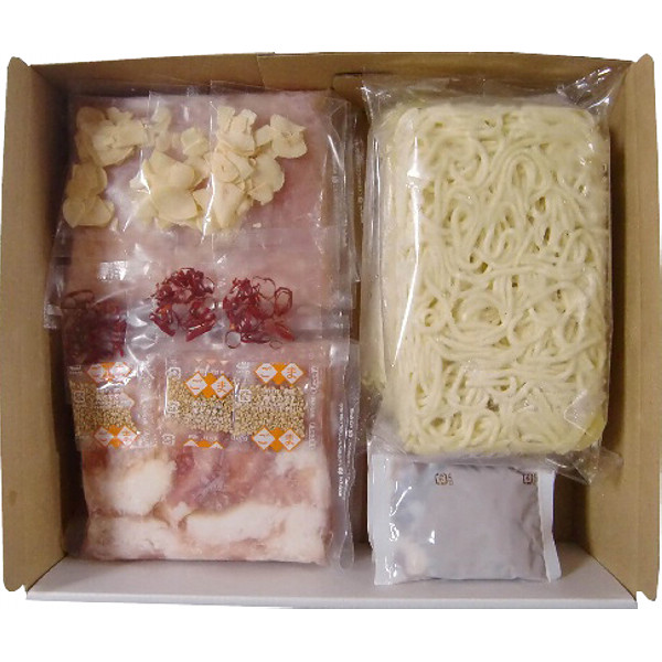 内容:牛もつ肉(国内産)100g×6袋、ちゃんぽん麺180g×3玉、にんにく3g×3袋、唐辛子0.5g×3袋、白ごま0.7g×3袋、もつ鍋用濃縮とんこつスープ36g×8袋※5~6人前