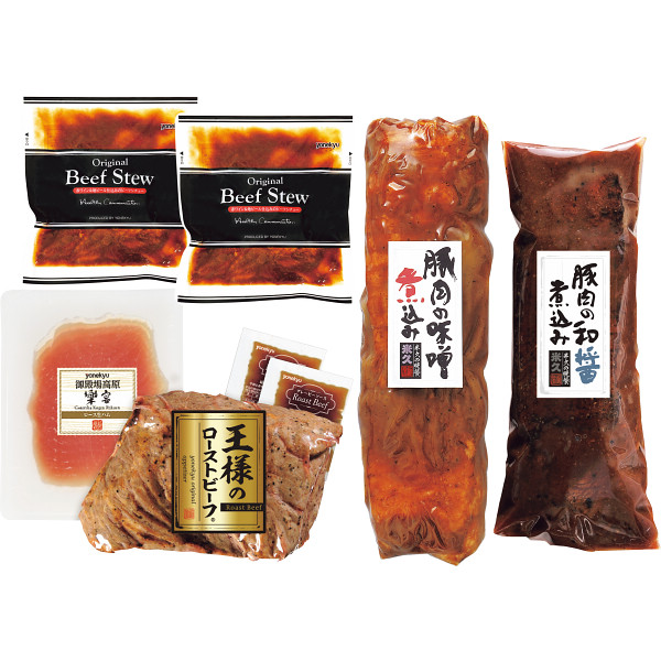 内容:王様ローストビーフ200g×1、グレービーソース25g×2、赤ワイン&地ビール仕込みビーフシチュー170g×2、ロース生ハム70g×1、豚肉の味噌煮込み450g×1、豚肉の和醤油煮込み450g×1