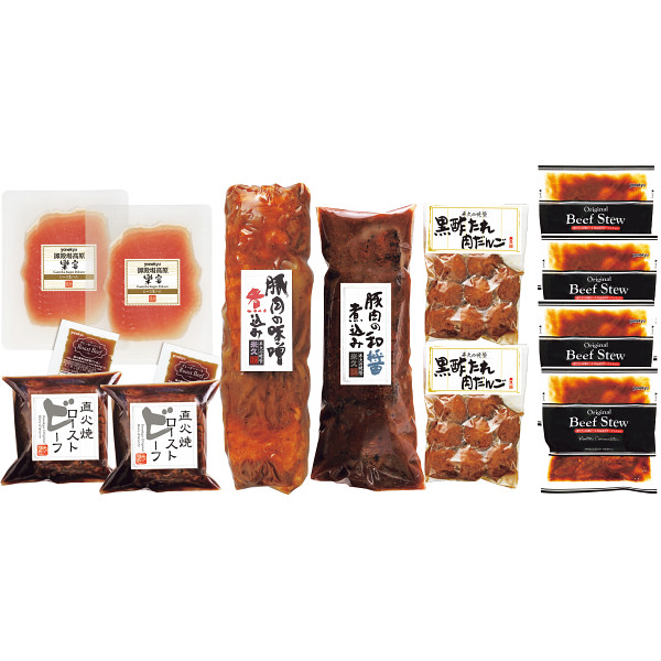 内容:直火焼ローストビーフ160g(グレービーソース付き)×2、ロース生ハム70g×2、豚肉の味噌煮込み450g×1、豚肉の和醤煮込み450g×1、黒酢たれ肉だんご300g×2、赤ワイン&地ビール仕込みビーフシチュー170g×4