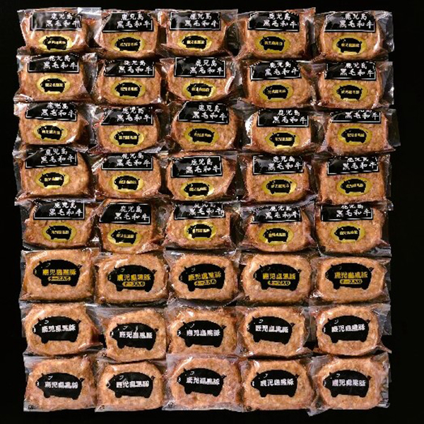内容:黒毛和牛黒豚ミックス生ハンバーグ80g×25、黒豚チーズ入り生ハンバーグ80g×5、黒豚ミニハンバーグ80g×10