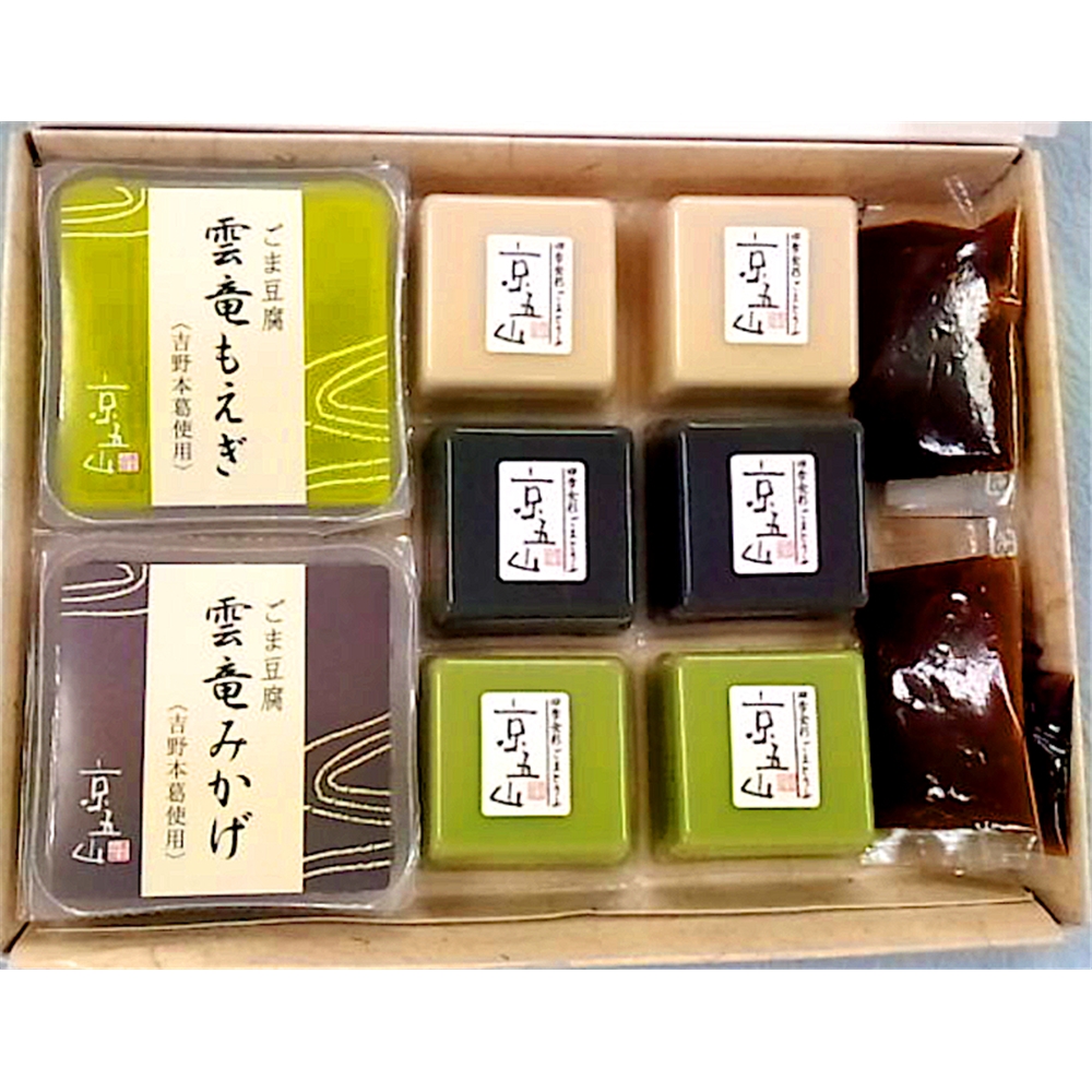 内容:雲竜みかげ100g×1、雲竜もえぎ100g×1、ごまとうふ(白、黒、抹茶)50g×各2、味噌だれ20g×2、ごま醤油ジュレ5g×2