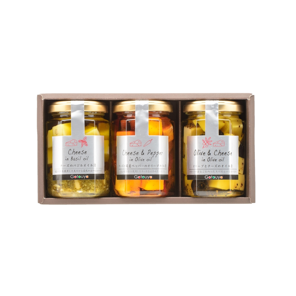 内容:チーズのバジルオイル漬100g×1、チーズと国産ペッパーのオリーブオイル漬100g×1、オリーブとチーズのオイル漬100g×1