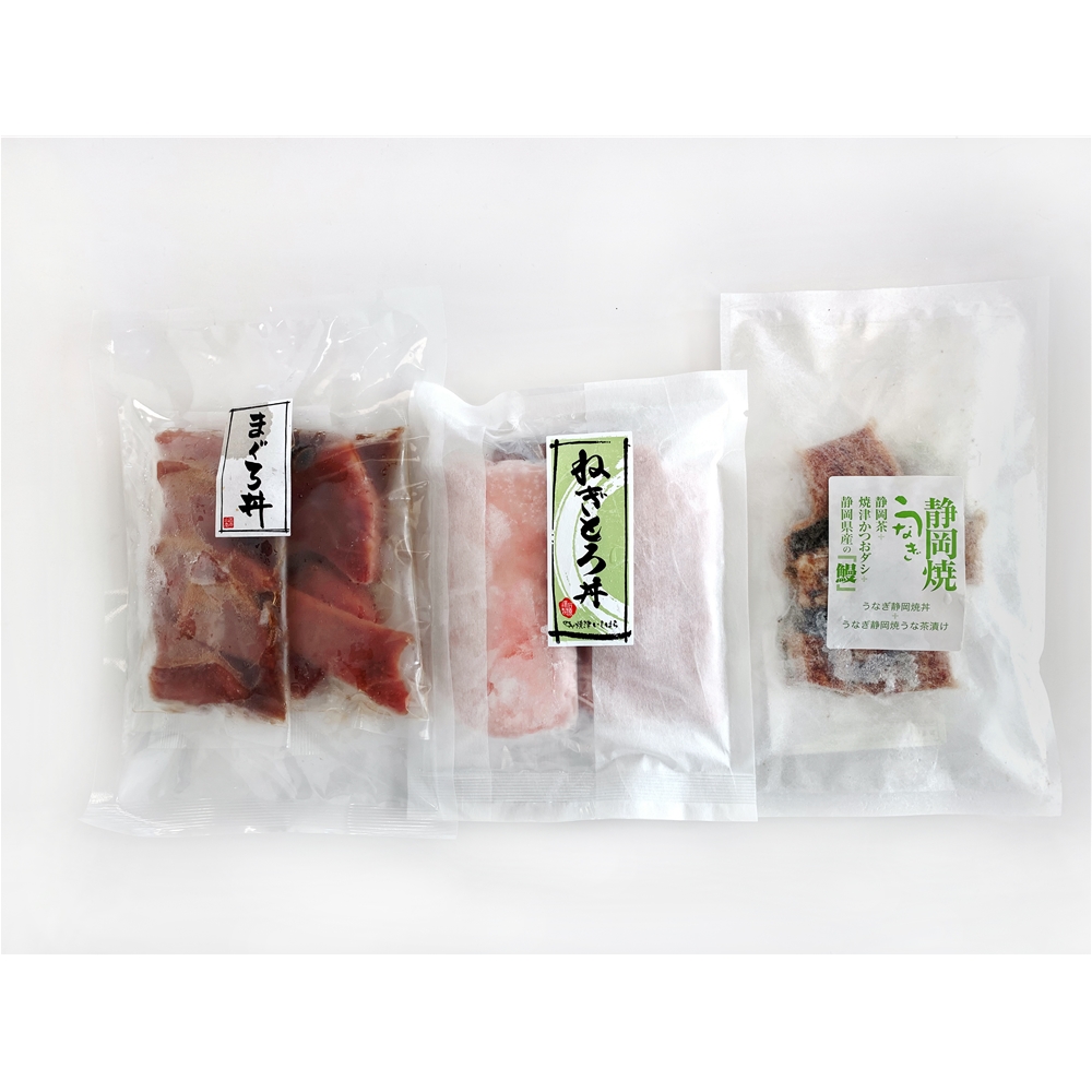 内容:まぐろ丼の具(キハダマグロ70g、たれ20g)×2、ねぎとろ丼の具(キハダマグロ・バチマグロ80g×2、添付品 たれ、おろしわさび、のり)、うなぎ静岡焼きひつまぶし(うなぎ70g、タレ15ml、だし汁10ml、乾燥ねぎ0.3g、刻み2.5g)
