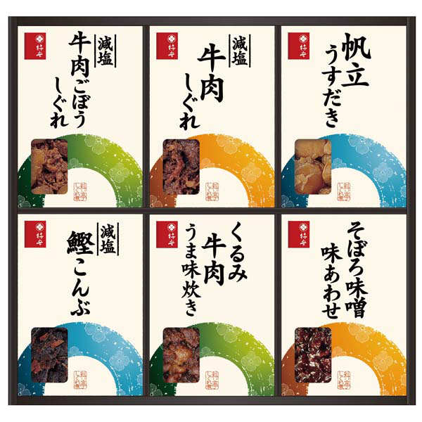 内容:減塩 牛肉しぐれ50g×1、減塩 牛肉ごぼうしぐれ50g×1、くるみ牛肉うま味炊き50g×1、減塩 鰹こんぶ50g×1、帆立うすだき40g×1、そぼろ味噌味あわせ90g×1