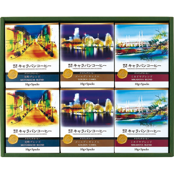 1928年に横濱馬車道で生まれた老舗「キャラバンコーヒー」をいつでもどこでも楽しめるドリパックコーヒーギフトセットです。看板商品ゴールデンキャメル、酸味とコクが一体となった元町ブレンド、爽やかな酸味と甘みのミカドヤブレンドの3種類のお味が楽しめます。 ※横濱001認定商品です。