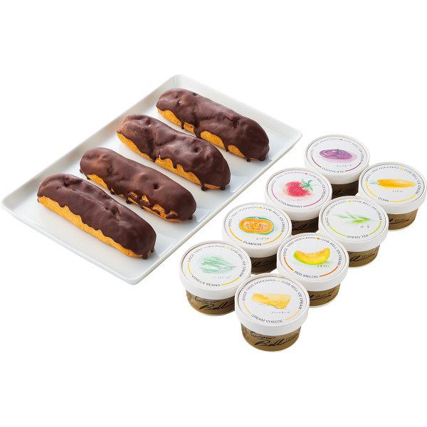 内容:バニラビーンズ・赤肉メロン・いちご・クリームチーズ・抹茶・チョコレート・かぼちゃ・とうきび各80ml×各1、エクレア53g×4