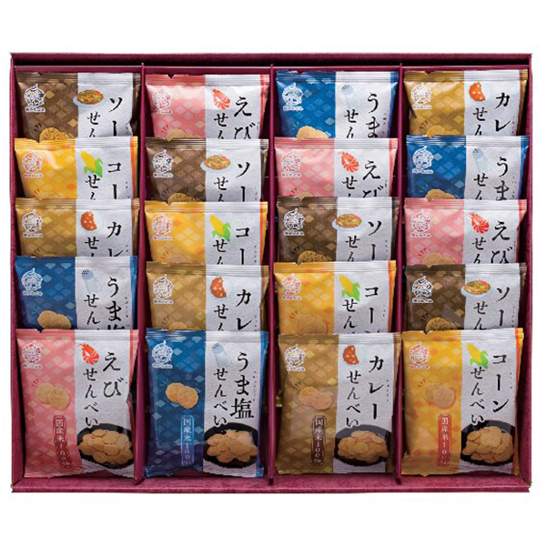 内容:えびせんべい・コーンせんべい・うま塩せんべい・ソースせんべい・カレーせんべい各15g×4