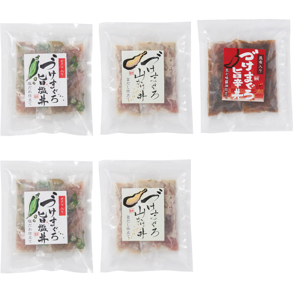内容:漬けまぐろ旨塩丼(80g×2)×2、漬けまぐろ山かけ丼(70g×2)×2、漬けまぐろ旨辛丼(70g×2)×1
