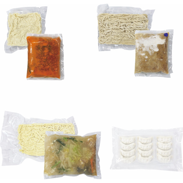 内容:太陽のラーメン(麺110g・スープ400g)・よってこや 屋台醤油ラーメン(麺130g・スープ380g)・横濱一品香 元祖絶品たんめん(麺140g・スープ600g)・横濱一品香 焼餃子(12個)×各1(麺の重量は生麺時)(スープは具材入り)