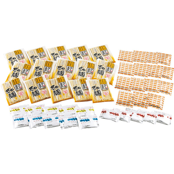内容:ラー麦麺(乾麺)80g×15、豚骨スープ35g×5、醤油スープ35g×5、味噌スープ35g×5、ラーメンふりかけ3g×15