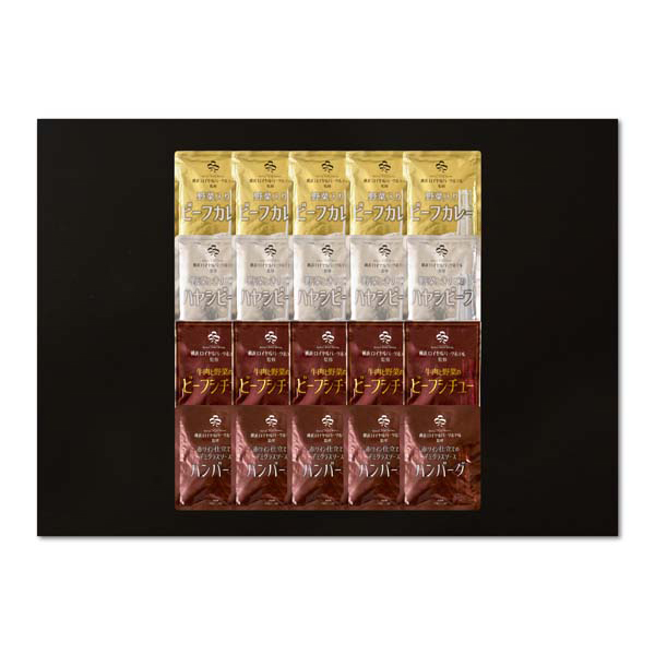 内容:野菜入りビーフカレー200g×5、野菜ときのこのハヤシビーフ180g×5、牛肉と野菜のビーフシチュー170g×5、赤ワイン仕立てのデミグラスソースハンバーグ180g×5