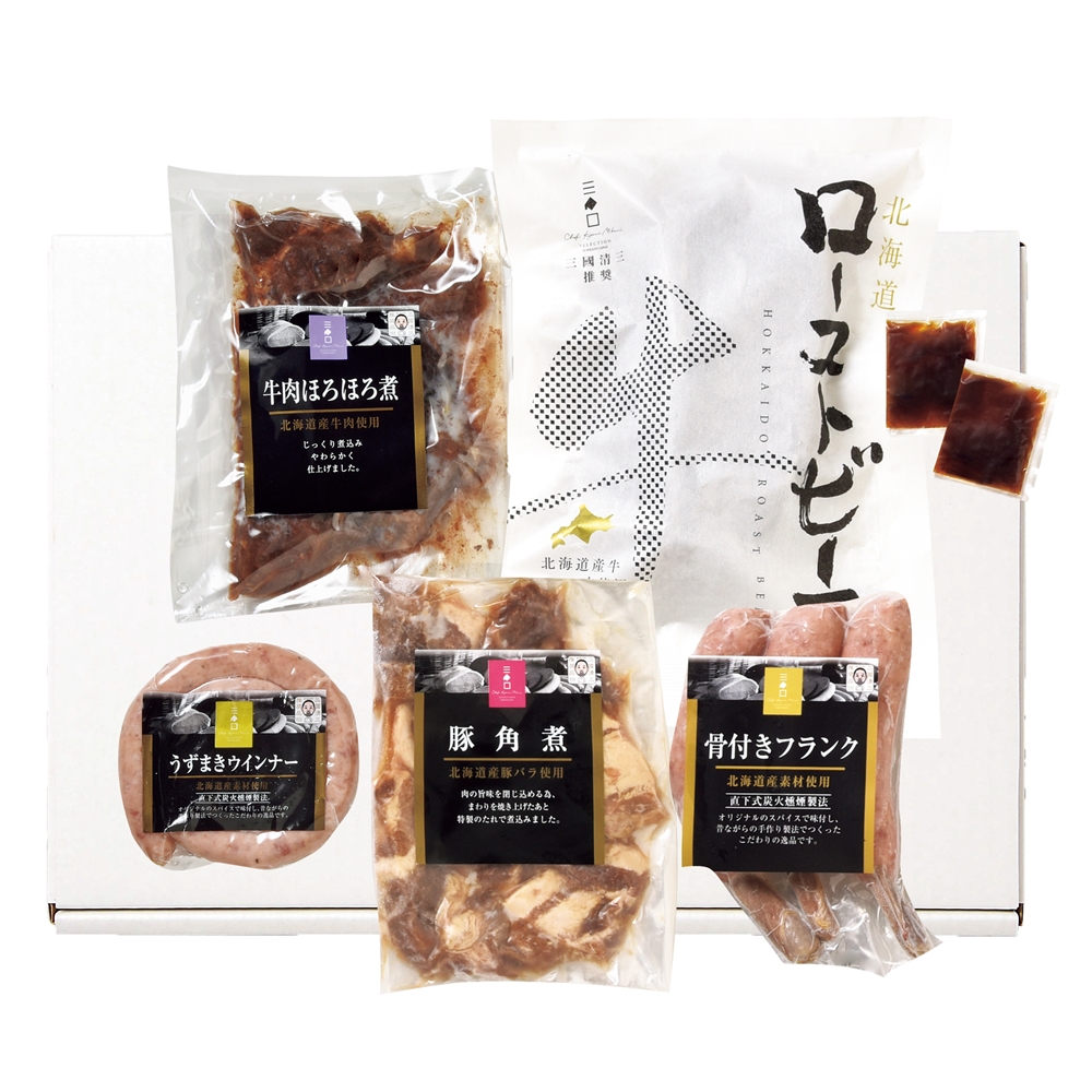 内容:三國推奨牛肉ほろほろ煮220g×1、三國推奨うずまきウインナー120g×1、三國推奨豚肉角煮190g×1、三國推奨骨付きフランク(80g×3)×1、三國推奨北海道産牛ローストビーフ400g×1、ローストビーフのタレ×2