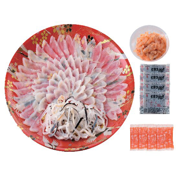 内容:とらふぐ刺身(30cm皿)90g、とらふぐ皮30g、とらふぐ塩辛60g、ふくポン酢・もみじおろし各10g×4