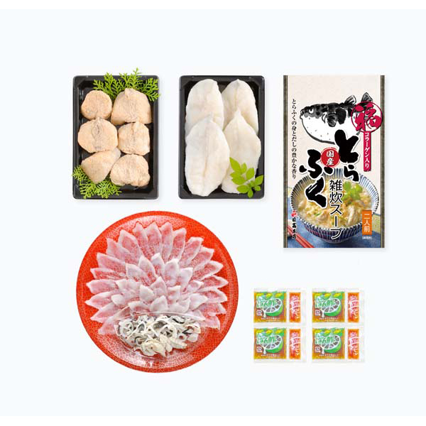 内容:とらふく刺身60g、とらふく皮湯引き30g、ごまふく一汐150g、ごまふく唐揚げ150g、とらふく雑炊スープ340g、ぽん酢・もみじおろし 各×4