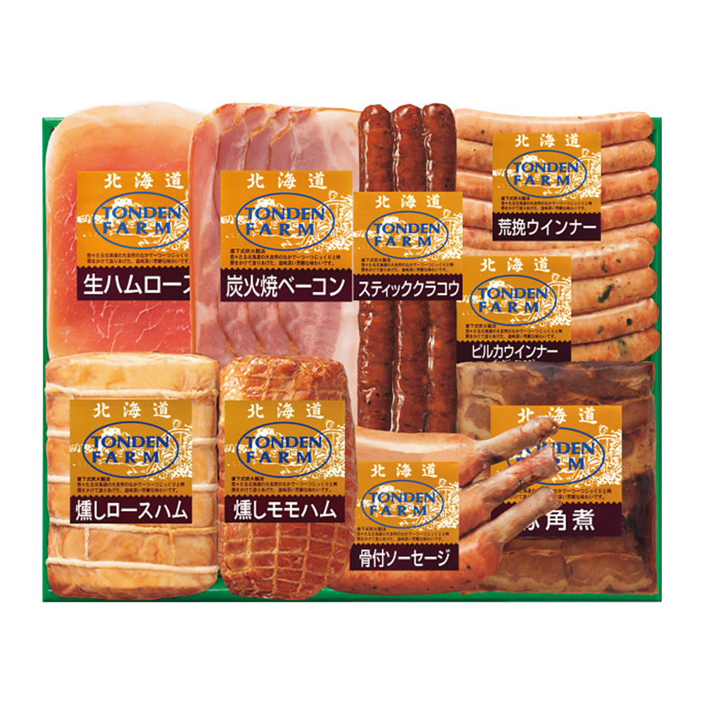 内容:生ハムロース(スライス)40g、炭火焼ベーコン(スライス)80g、スティッククラコウ・80g、燻しロースハム300g、燻しモモハム300g、荒挽ウインナー100g、ピルカウインナー120g、骨付ソーセージ180g、豚角煮160g
