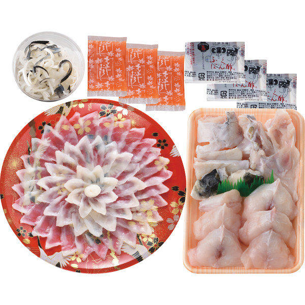 内容:とらふぐ刺身65g、とらふぐ皮30g、ふぐちり(シロサバフグ切身、トラフグアラ)360g、ふくポン酢10g×3、もみじおろし10g×3