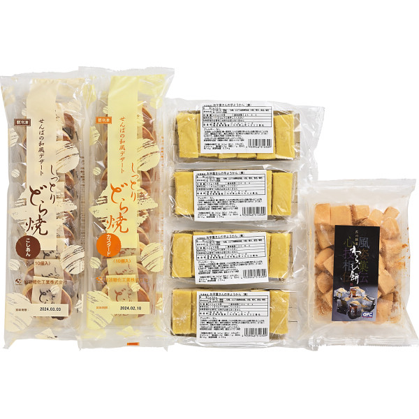 内容:わらび餅(きな粉)500g×1、ミニどら焼きこしあん(40g×10)×1、ミニどら焼きカスタード(40g×10)×1、芋ようかん(40g×6)×4
