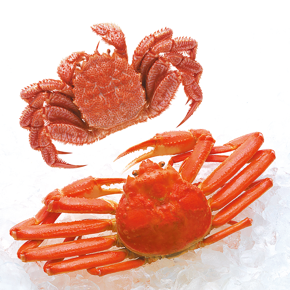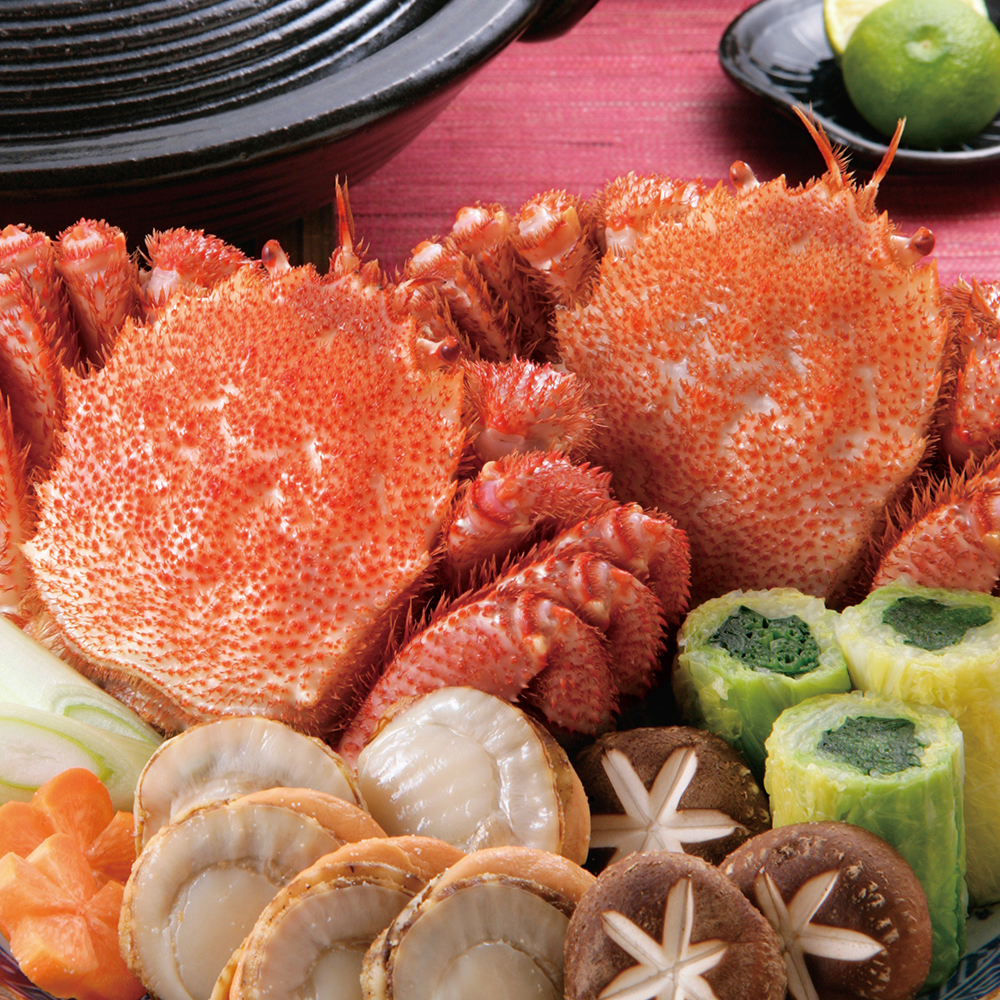 繊細で上品な味わいのズワイ蟹と味噌たっぷりの毛蟹をセットしました。 毛蟹の甲羅をはずして鍋に入れると 味噌と出汁で蟹の風味が十分に満喫できる鍋に仕上が ります。鋼の具材には鶏肉や鮭の切り身、いか真丈、蟹真丈、うどん、出汁がセットになっています。