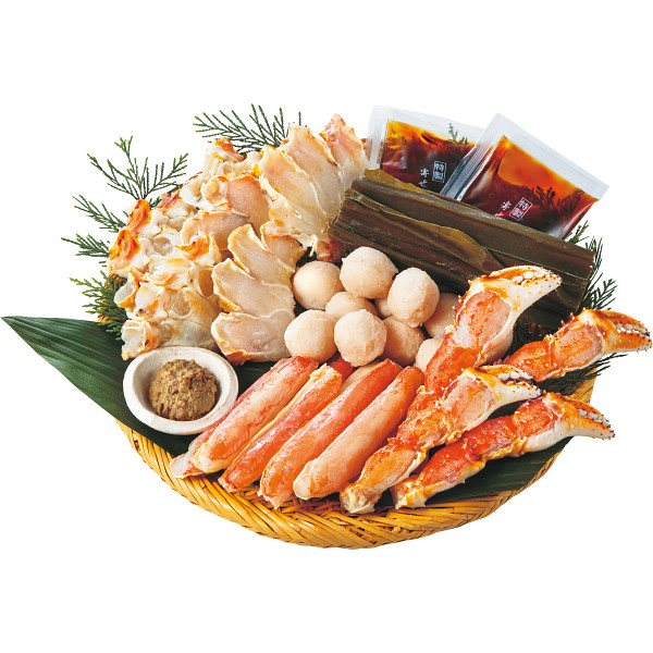 内容:生たらばがにカット(たらばがに:ロシア産)450g、生ずわいがにカット(ずわいがに:ロシア産)200g、かに入り団子180g、かにみそ20g、たれ50g×2P、だし昆布15g