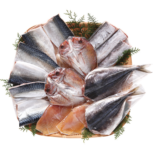 内容:ソフト干物(サバ300g×3・アジ150g×2・タイ150g×2・タチウオ200g・エイヒレ100g×2)