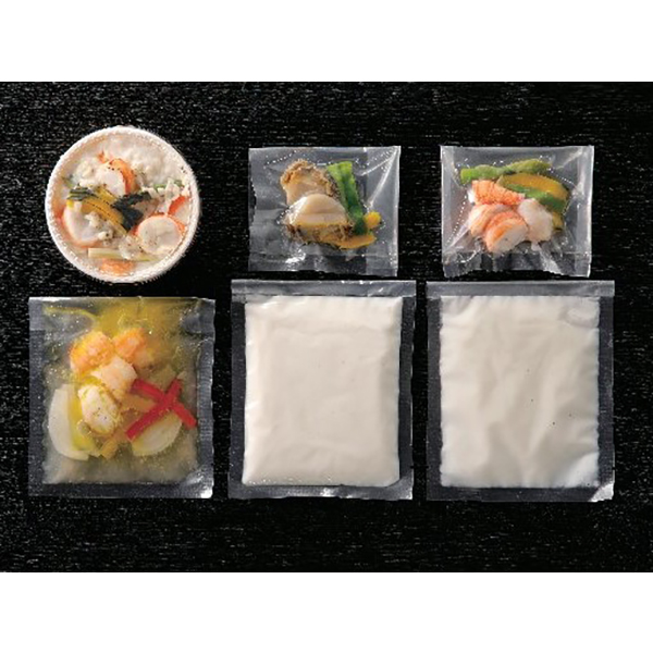 内容:伊勢海老のホワイトソース煮(伊勢海老25g(ボイル南瓜・アスパラ入)、伊勢海老ホワイトソーススープ150g)、あわびクリーム煮スープ(あわび10g(ボイル南瓜・アスパラ入)、クリームスープ160g)、伊勢海老グラタン150g、伊勢海老マリネ120g