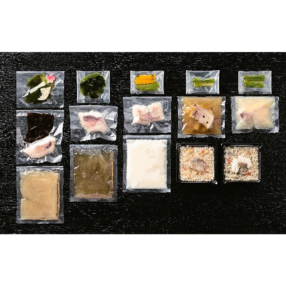 内容:甘鯛と季節野菜の吸い物(甘鯛35g、出汁150g、湯通しわかめ・みつば)、甘鯛炊き込みごはん・甘鯛のリゾット各180g、甘鯛酒蒸し野菜あんかけ(甘鯛35g(昆布付)、あんかけ出汁150g、湯通し筍・梅麩・みつば)、甘鯛とかぼちゃのクリームスープ(甘鯛35g、クリームスープ100g、ボイル南瓜・アスパラ)、甘鯛とアスパラのワインソース(レモン風味)焼き(甘鯛とワインソース60g、ボイルアスパラ)、甘鯛のアクアパッツア(甘鯛とアクアパッツアソース180g、ボイルアスパラ)