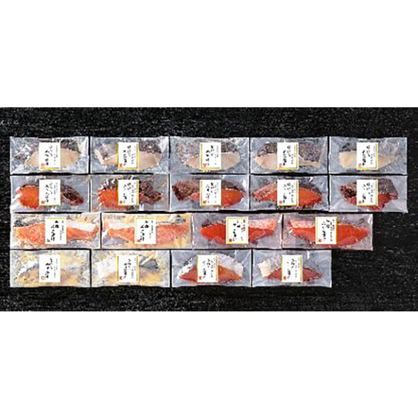 内容:銀ダラ西京漬70g×5、銀ダラ味醂漬70g×5、紅鮭西京漬70g×2、紅鮭味醂漬70g×2、サワラ西京漬70g×2、サワラ味醂漬70g×2