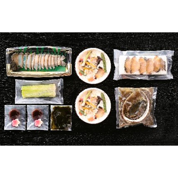 内容:あわびしゃぶしゃぶセット2人前(あわび50g、ボイル白菜巻き(ほうれん草・人参入)×1、湯通しわかめ20g、生麩としいたけ×2)、あわびグラタン150g×2、あわびバター蒸し(殻付き)180g、煮あわび棒寿司200g