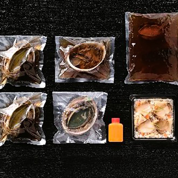 内容:黒あわび和三盆煮(殻付き)200g×2、あわび炊き込みご飯180g、あわびステーキ(あわび(殻付き)70g、ウニソース30g)、あわびオイスターソース煮込み(殻付き)・あわびとなまこの醤油煮各250g