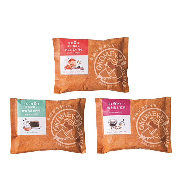 内容:手揚げ京あられ×3袋(旨み香る干し海老と伊豆大島の海塩16g・甘く香ばしい炊き出し醤油15g・ふわりと香る国産海苔と伊豆大島の海塩17g×各1袋)