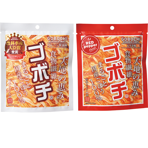国産ごぼうスライスをそのまま素揚げし、こだわりのだし醤油で風味豊かに仕上げました。2種類の味がお楽しみ頂けます。
