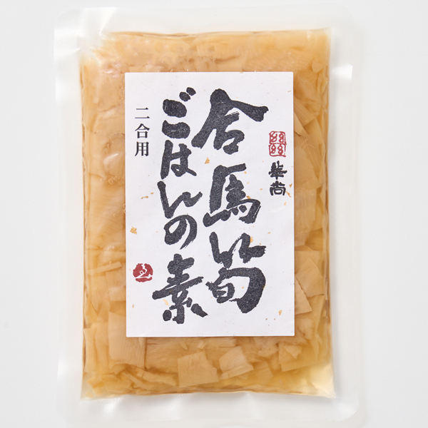 保水力のある粘土質の赤土の大地で育ち、アクが少なく香り、味、歯ごたえに優れ、関西地方の一流料亭で指名される合馬の筍。ごはんと一緒に炊き込むだけでその風味と美味しさを味わえる本格的な筍ごはんをお楽しみください。