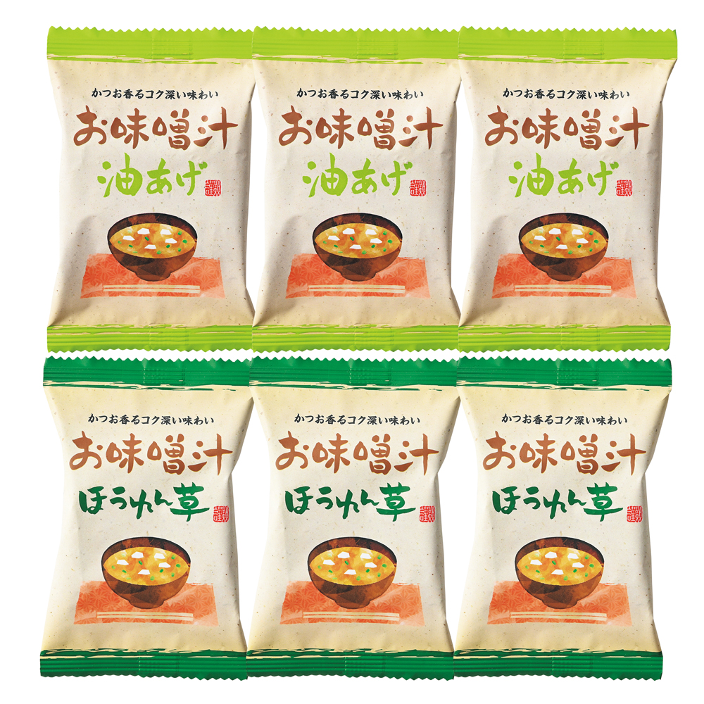 国内産の米みそを使用し、かつおの風味をきかせたコク深い味わいのお味噌汁にほうれん草とわかめを合わせた「お味噌汁ほうれん草」。ふんわり食感の油あげと磯の香り漂うわかめを合わせた「お味噌汁油あげ」。